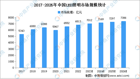 隨著中國LED照明滲透率進一步提升,中國LED照明市場規(guī)模保持較大幅度增長,按下游應用環(huán)節(jié)產(chǎn)值計算,由2017年的5343億元上升到2021年的6552億元,年均復合增長率為5.2%。隨著行業(yè)發(fā)展?jié)u趨穩(wěn)定,預計LED照明市場規(guī)模將由2022年的6813億元增長到2026年的7386億元,年均復合增長率將達到2.0%。