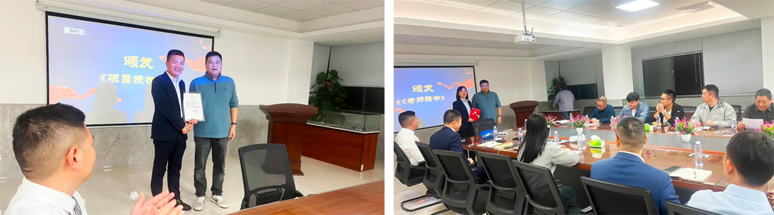 會上,陳總為遠(yuǎn)大方略項目組頒發(fā)授權(quán)書,授予項目管理權(quán),同時為項目組老師頒發(fā)聘書,聘請老師為此次改善項目輔導(dǎo)老師,全力推進(jìn)此次項目開展。