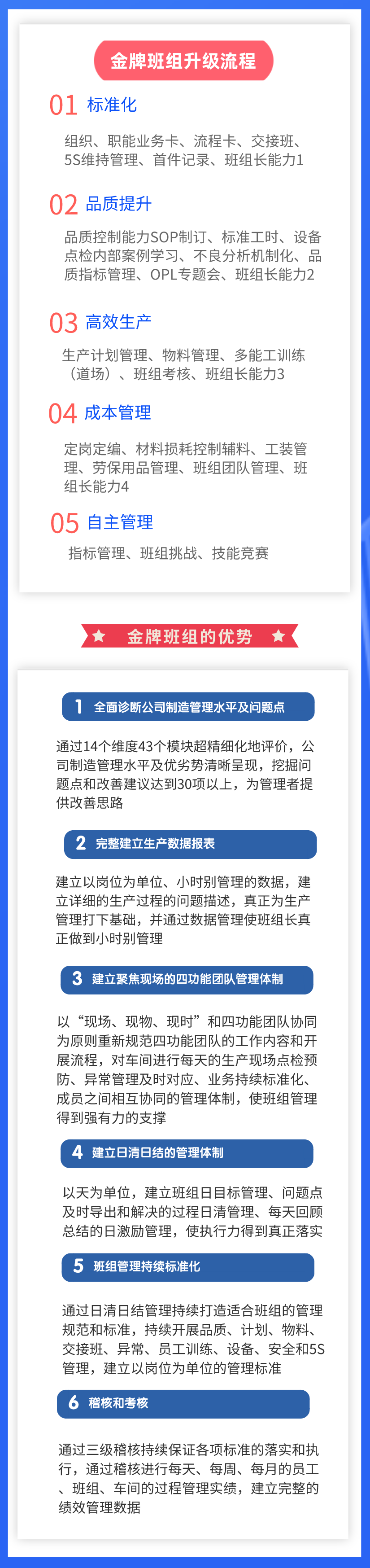 遠(yuǎn)大咨詢集團(tuán)根據(jù)100多家企業(yè)服務(wù)經(jīng)驗開發(fā)基層班組管理咨詢產(chǎn)品。以推進(jìn)班組管理各方面業(yè)務(wù)的標(biāo)準(zhǔn)化開始,從班組管理規(guī)范化開始,逐步推進(jìn)班組的品質(zhì)管理能力,效率管理能力,成本管理能力,逐步達(dá)到班組自主管理的程度。