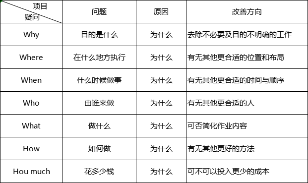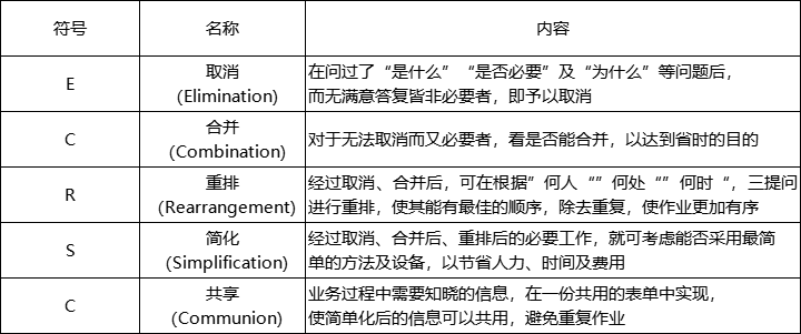 對現(xiàn)有的工作方案進行考核分析的目的是為了建立新的工作方法和新的工作秩序,這樣就要求改善工作打破傳統(tǒng)的工作方式,靈活運用以下五大原則對現(xiàn)行的工作方法進行革新。如表所示: