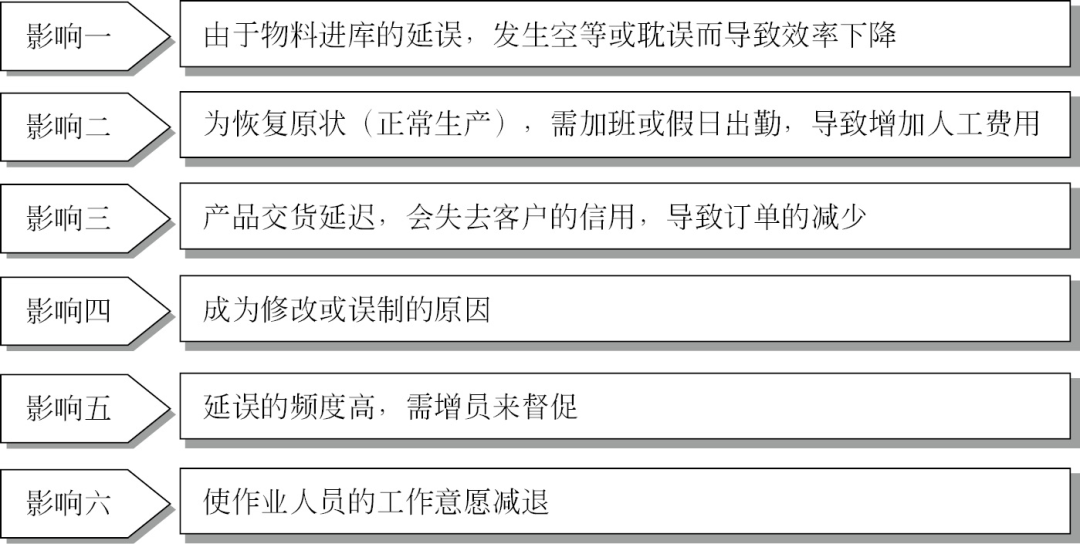 有可能延遲交貨的物料,應(yīng)予早期發(fā)現(xiàn),從而防止其發(fā)生,同時(shí)也應(yīng)抑制無(wú)理由的提早交貨。交期的延遲,毫無(wú)疑問(wèn)會(huì)妨礙生產(chǎn)活動(dòng)的順利進(jìn)行,對(duì)生產(chǎn)現(xiàn)場(chǎng)及其有關(guān)部門(mén)將帶來(lái)有形、無(wú)形的不良影響(圖1)。