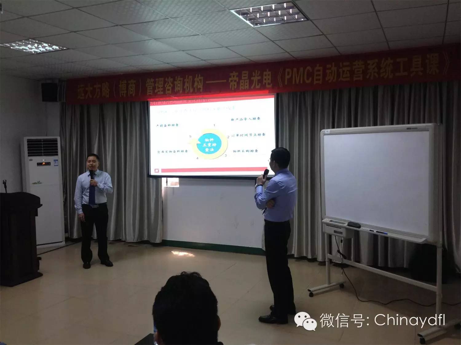 雷志軍老師與劉再?gòu)?qiáng)老師在詳細(xì)講解物料五重排查法以及物料齊套管理困難后果