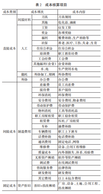 按照汽車模具制造成本構成情況,整理成本核算涉及項目如表2所示。