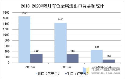 2018-2020年5月有色金屬進(jìn)出口貿(mào)易額統(tǒng)計