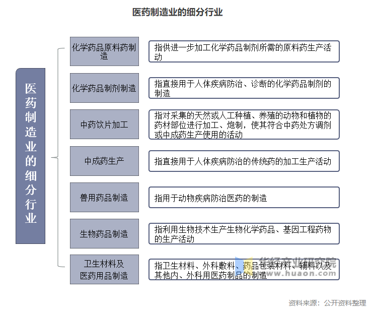2、細(xì)分行業(yè):醫(yī)藥制造業(yè)具體可以細(xì)分為化學(xué)藥品原料藥制造、化學(xué)藥品制劑制造、中藥飲片加工、中成藥生產(chǎn)、獸用藥品制造、生物藥品制造和衛(wèi)生材料及醫(yī)藥用品制造七個行業(yè)。我國醫(yī)藥制造企業(yè)是指以藥品研發(fā)、生產(chǎn)及銷售為主的企業(yè)。根據(jù)具體藥品生產(chǎn)業(yè)務(wù)線的不同,《中國高技術(shù)產(chǎn)業(yè)統(tǒng)計年鑒》將我國醫(yī)藥制造業(yè)分為三大種類:化學(xué)藥品制造、生物藥品制造和中成藥制造。