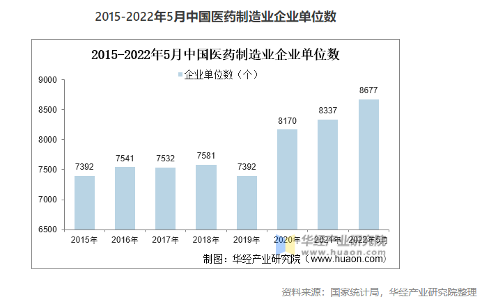 疫情前,受政策控制和行業(yè)嚴(yán)格監(jiān)管的影響,我國醫(yī)藥制造業(yè)企業(yè)單位數(shù)量較為穩(wěn)定,研發(fā)能力較弱的中小型企業(yè)逐漸退出市場,2020年疫情席卷全球,市場迫切需要大量藥品和疫苗研發(fā),企業(yè)數(shù)量開始增長,截止2022年5月我國醫(yī)藥制造業(yè)企業(yè)有8677家。