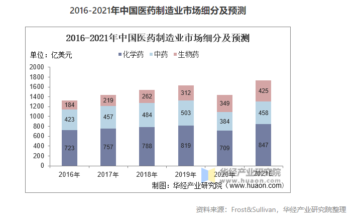 醫(yī)藥制造業(yè)三大種類中,化學(xué)藥的市場占比最多,化學(xué)藥主要用于人體疾病防治、診斷。應(yīng)用領(lǐng)域較為廣泛和普及,2020年我國化學(xué)藥市場規(guī)模大709億美元,占比49.2%;生物藥憑借其藥理活性高、特異性強(qiáng)、治療效果好等特點(diǎn),越來越受市場關(guān)注,其市場規(guī)模由2016年的184億美元增長至2020年的349億美元。慢性病的治療周期較長,我國中藥在慢性病的治療中具有不可替代的作用,2021年我國中藥制造企業(yè)規(guī)模預(yù)計為458億美元。
