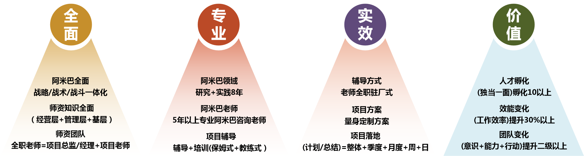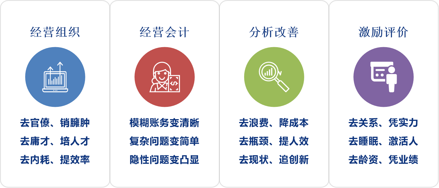 4、數(shù)據(jù)增長(zhǎng):(1) 公司高層、中層、基本價(jià)值觀高度統(tǒng)一;(2)公司企業(yè)文化清晰明確,提倡什么、禁止什么清楚明了;(3)組織架構(gòu)調(diào)整實(shí)施,責(zé)、權(quán)、利下放至各事業(yè)部;(4)事業(yè)部實(shí)現(xiàn)獨(dú)立財(cái)務(wù)核算;(5)事業(yè)部?jī)?nèi)各阿米巴實(shí)現(xiàn)獨(dú)立財(cái)務(wù)核算;(6) 人才培養(yǎng)機(jī)制初步形成;(7) 持續(xù)降低成本的自主運(yùn)營(yíng)機(jī)制初步建立;(8)公司利潤(rùn)率提升5%,凈利潤(rùn)提升80%。
